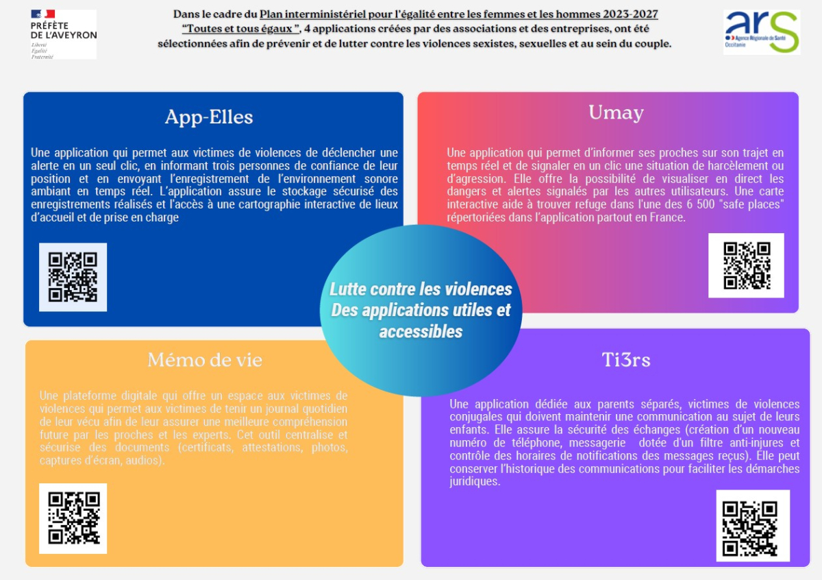 Dans le cadre du Plan interministériel pour l’égalité entre les femmes et les hommes 2023 – 2027 « Toutes et Tous égaux » : 4 applications créées par des associations et des entreprises, ont été sélectionnées afin de prévenir et de lutter contre les violences sexistes, sexuelles et au sein du couple.