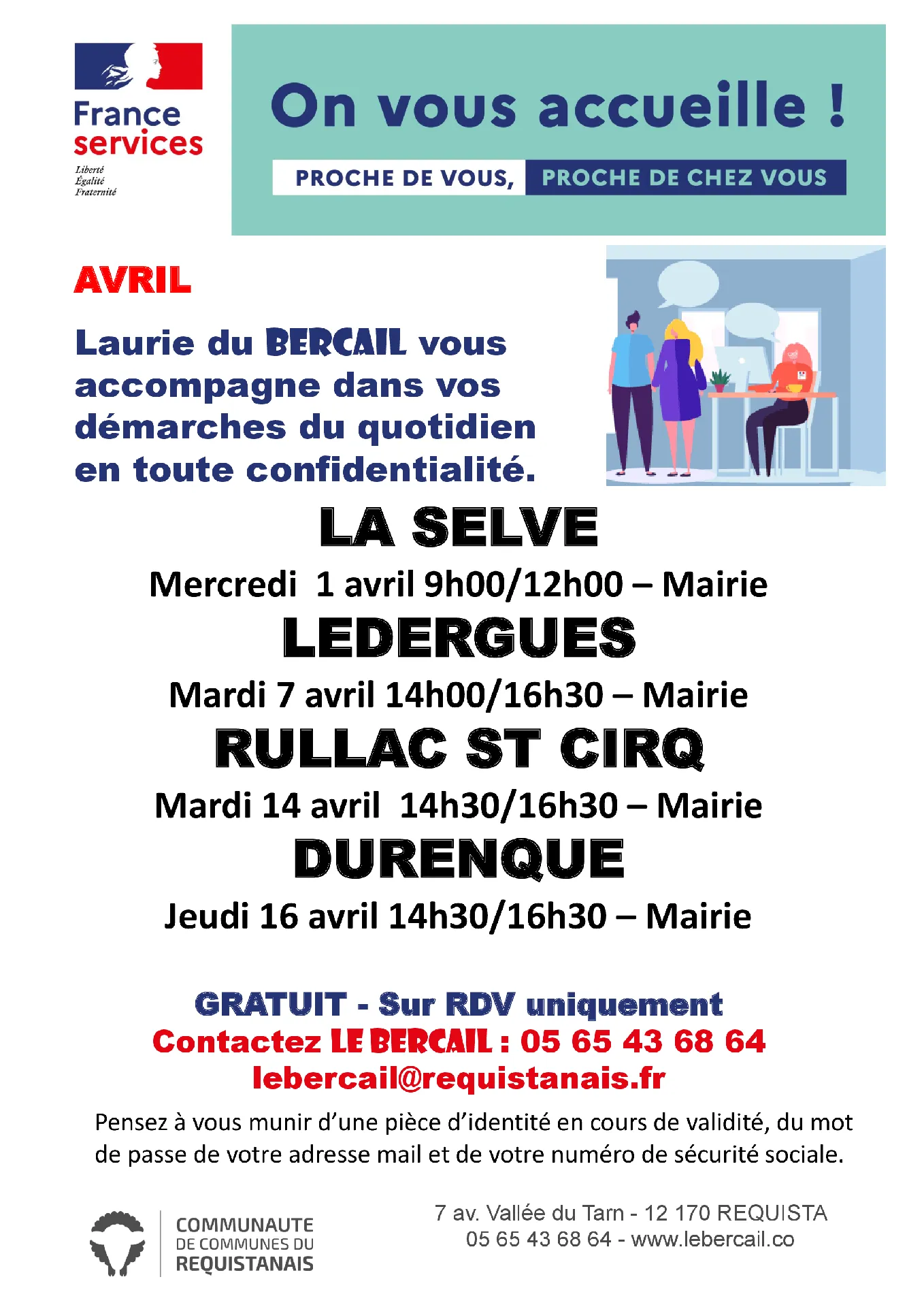 A 14h 30 à la mairie de La selve Laurie du Bercail vous accompagne dans vos démarches du quotidien en toute confidentialité.